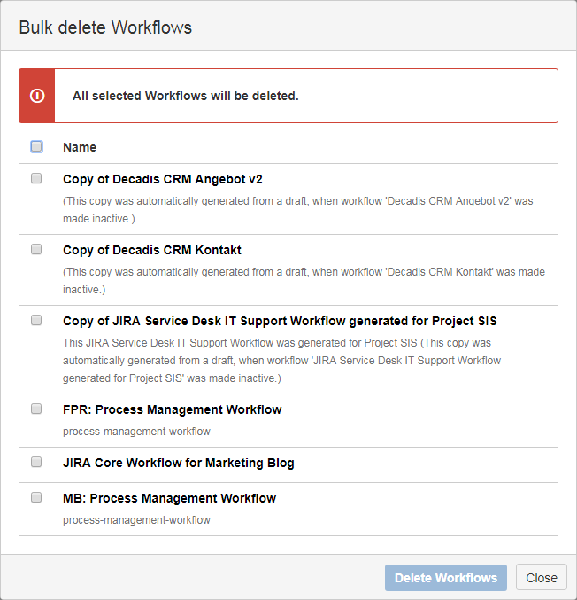 The mass delete operation just works for unused (e.g. unused field configurations) or inactive (e.g. inactive workflows) items in Jira.