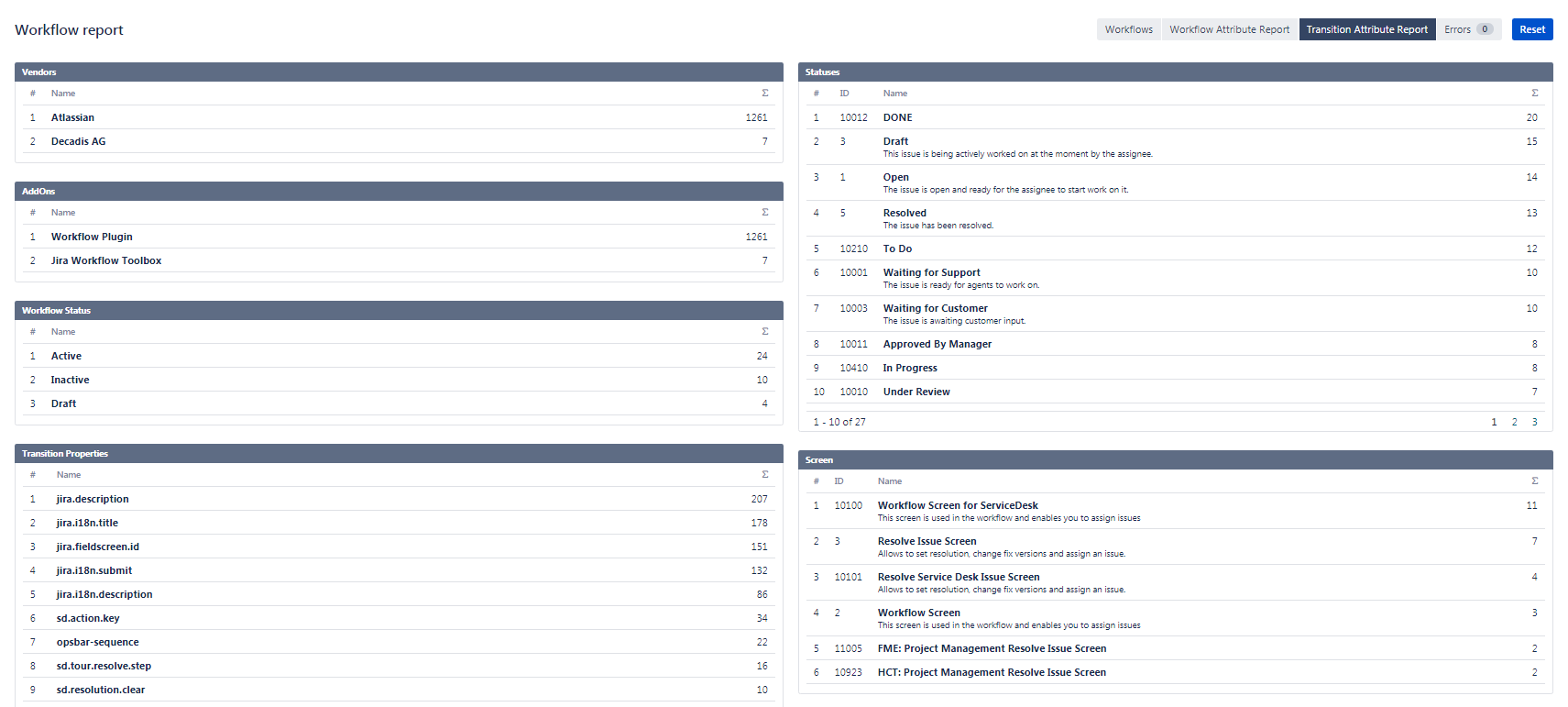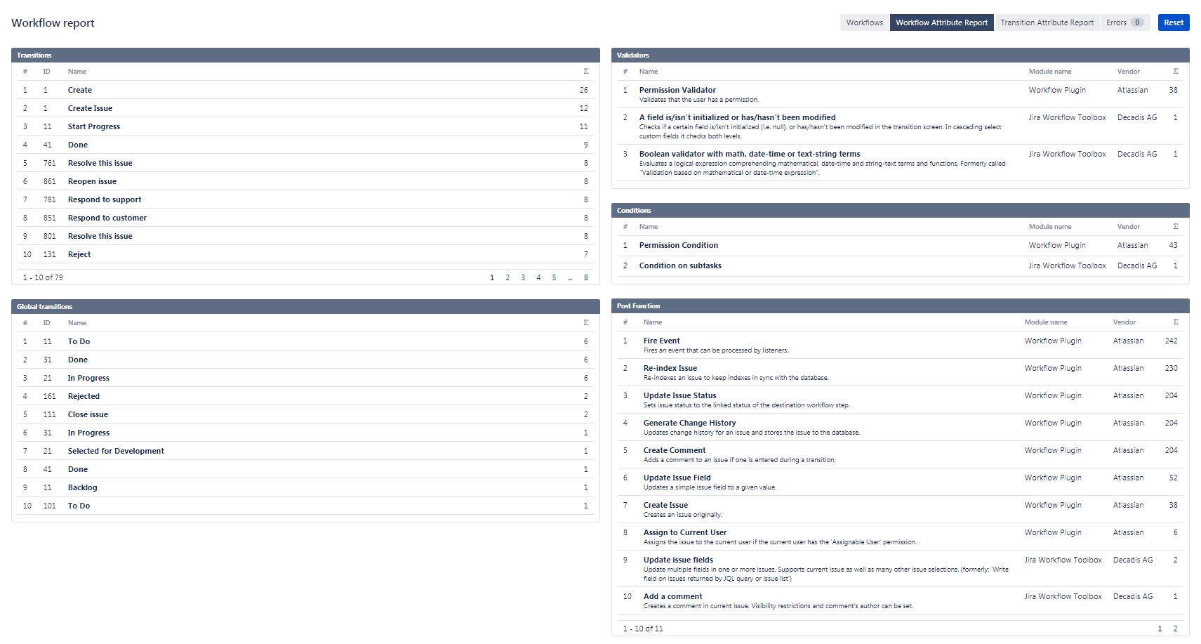 This feature allows administrators to get an overview of existing workflows in your system, including the number of validators, conditions, and post functions used and grouped by apps.