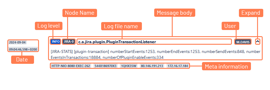 Meta information | Displays additional data related to the log entry, such as request details, server IDs, IP addresses, or other context that may assist in troubleshooting. |